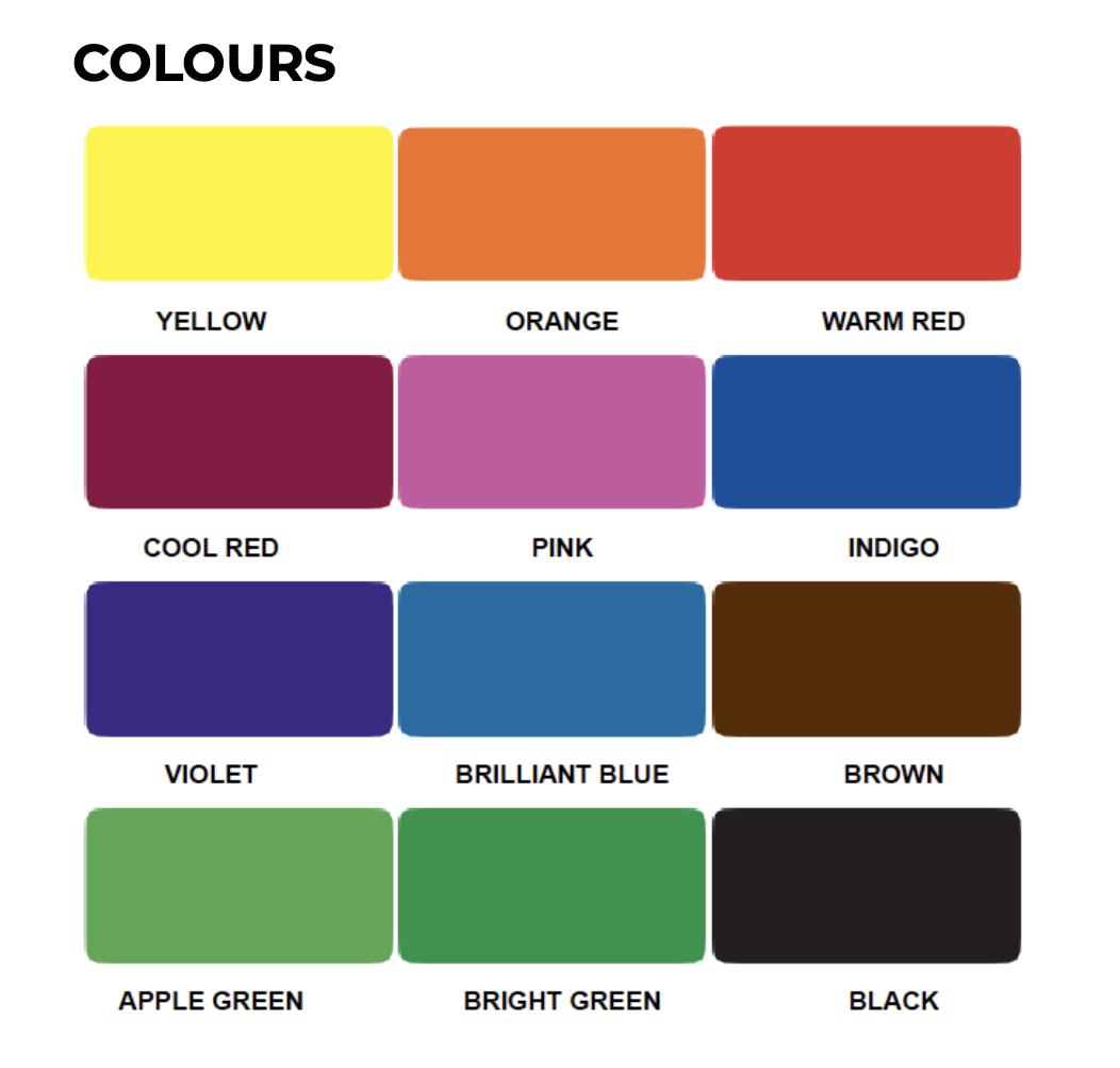 | Colour | YELLOW, ORANGE, WARM RED, COOL RED, PINK, INDIGO, VIOLET, BRILLIANT BLUE, BROWN, APPLE GREEN, BRIGHT GREEN, BLACK |